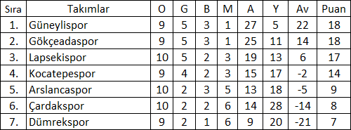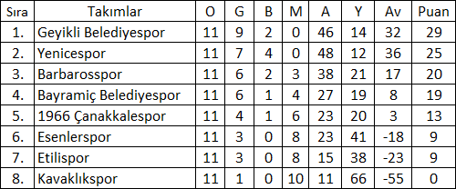 Çanakkale Birinci Amatör Lig 11.Hafta A-Grubu Puan Durumu: