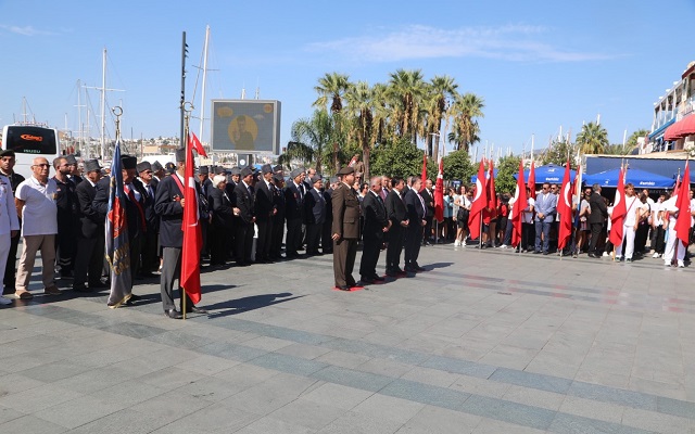 Bodrum Kaymakamlığı tarafından Belediye Meydanında düzenlenen törene Bodrum Kaymakamı Mustafa Çit, Bodrum Belediye Başkanı Ahmet Aras, Bodrum Garnizon Komutanı Personel Albay Ertan Benli, Cumhuriyet Başsavcısı Hasan Dalak, belediye başkan yardımcıları, birim müdürleri, Türkiye Muharip Gaziler Derneği Bodrum Şube Başkanı Hasan Külcü, gaziler, şehit ve gazi yakınları, siyasi parti, STK temsilcileri, Bodrum’daki okullardan müdürler, öğretmenler, öğrenciler ve vatandaşlar katıldı.