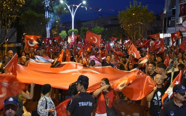 Gazi Süleyman Paşa Heykeli önünde bir araya gelen protokol üyeleri ile vatandaşlar, ellerindeki Türk bayrakları ve meşalelerle İskele Meydanı’na kadar yürüdüler.