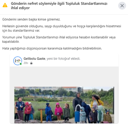 Facebook 10 Mayıs 2023 Çarşamba Günü Saat 15:26’da yayınlanan Aromatik ve Tıbbi Bitkiler Parkı haberi için “Gönderin nefret söylemiyle ilgili topluluk standartlarımızı ihlal ediyor” başlığıyla aşağıdaki bilgilendirmeyi göndermiş.