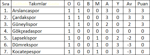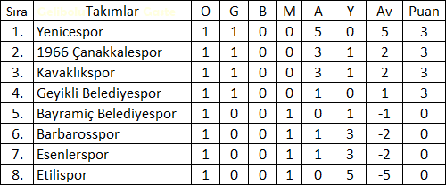 Çanakkale Birinci Amatör Lig B-Grubu 1.hafta Puan Durumu: