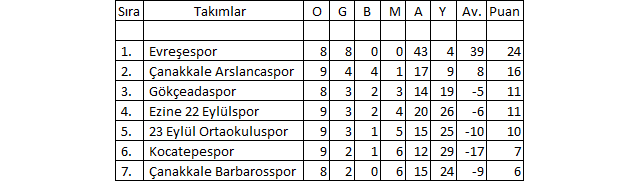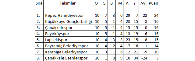Çanakkale Birinci Amatör Lig B-Grubu 10.Hafta Puan Durumu: