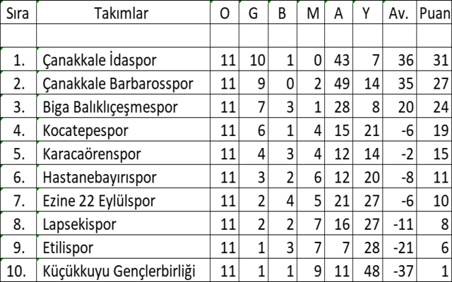 Çanakkale Birinci Amatör Lig 11.Hafta Puan Durumu: