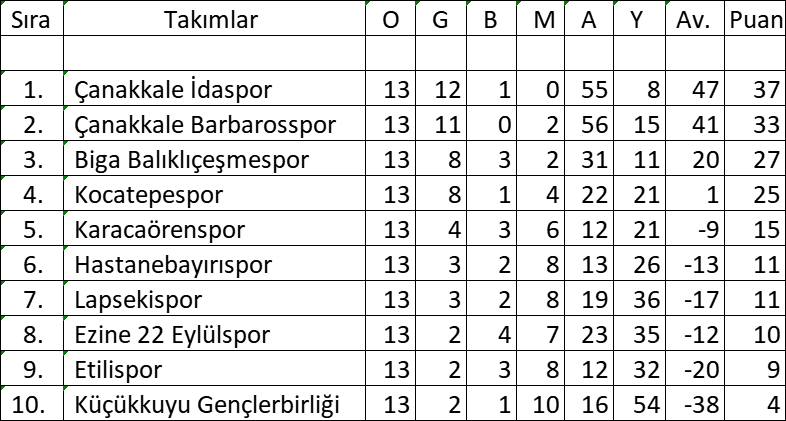 Çanakkale Birinci Amatör Lig 13.Hafta Puan Durumu: