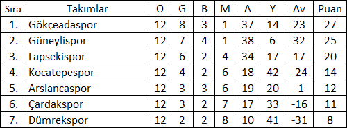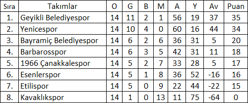 Çanakkale Birinci Amatör Lig A-Grubu 14.Hafta Puan Durumu: