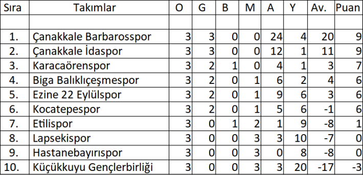 Çanakkale Birinci Amatör Lig 3.Hafta Puan Durumu: