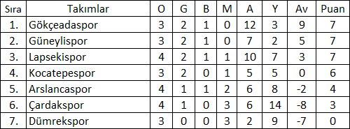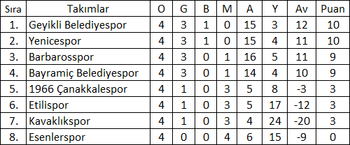 Çanakkale Birinci Amatör Lig 4.Hafta B-Grubu Puan Durumu: