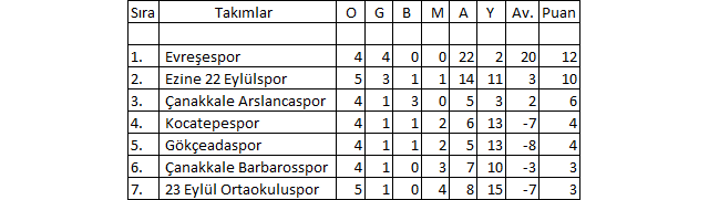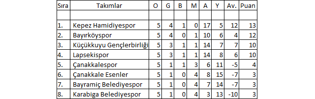 Çanakkale Birinci Amatör Lig B-Grubu 5.Hafta Puan Durumu:
