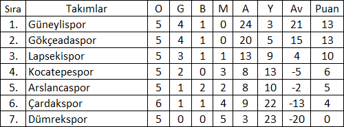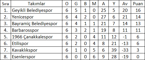 Çanakkale Birinci Amatör Lig 6.Hafta A-Grubu Puan Durumu: