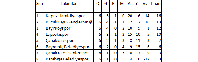 Çanakkale Birinci Amatör Lig B-Grubu 6.Hafta Puan Durumu: