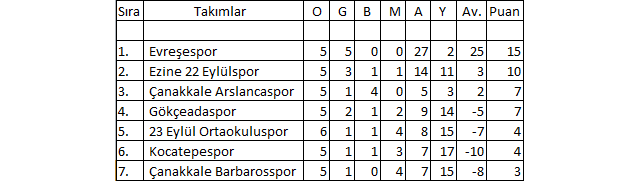 Çanakkale Birinci Amatör Lig B-Grubu 6.Hafta Puan Durumu: