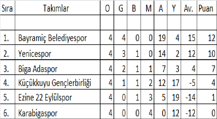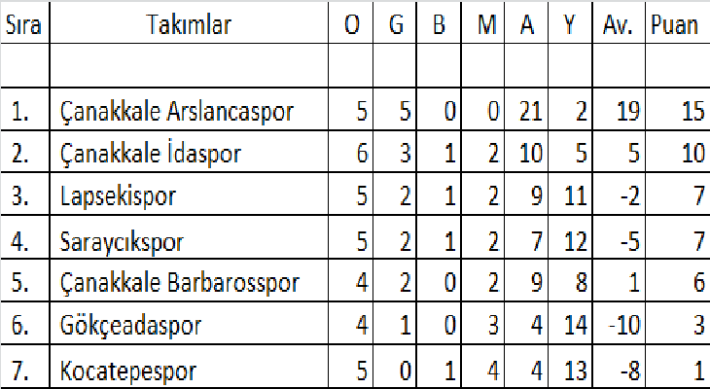 Çanakkale Birinci Amatör Lig A-Grubu 6.Hafta Puan Durumu:
