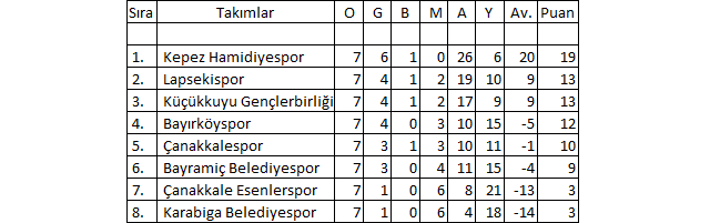 Çanakkale Birinci Amatör Lig A-Grubu 7.Hafta Puan Durumu:
