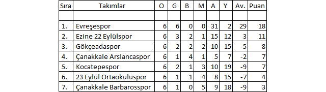 Çanakkale Birinci Amatör Lig B-Grubu 7.Hafta Puan Durumu: