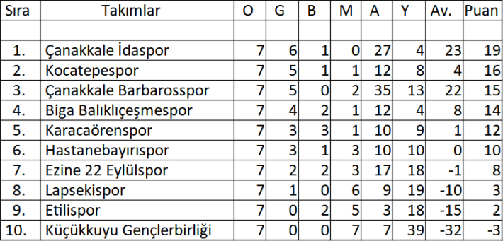 Çanakkale Birinci Amatör Lig 7.Hafta Puan Durumu: