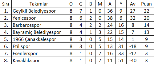Çanakkale Birinci Amatör Lig 8.Hafta B-Grubu Puan Durumu:
