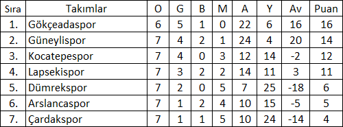 Çanakkale Birinci Amatör Lig 8.Hafta A-Grubu Puan Durumu: