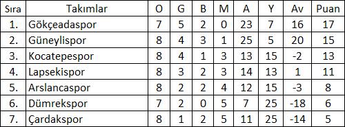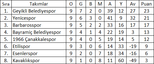 Çanakkale Birinci Amatör Lig 9.Hafta A-Grubu Puan Durumu: