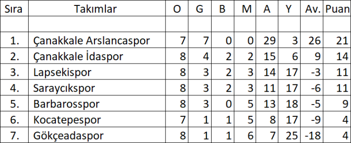 Çanakkale Birinci Amatör Lig A-Grubu 9.Hafta Puan Durumu: