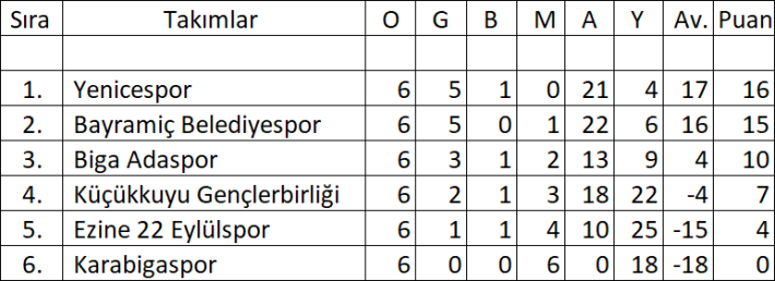 Çanakkale Birinci Amatör Lig B-Grubu 6.Hafta Puan Durumu: