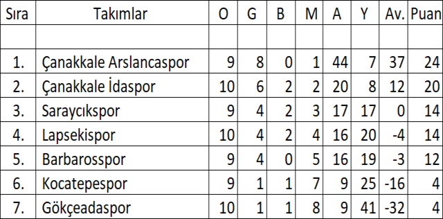 Çanakkale Birinci Amatör Lig A-Grubu 11.Hafta Puan Durumu: