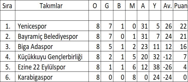 Çanakkale Birinci Amatör Lig B-Grubu 8.Hafta Puan Durumu: