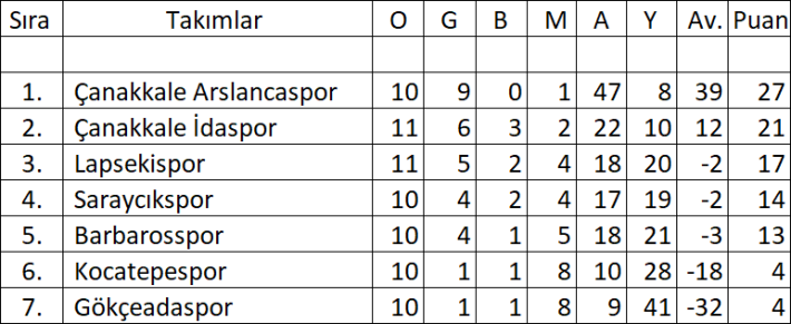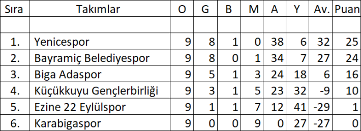 Çanakkale Birinci Amatör Lig B-Grubu 9.Hafta Puan Durumu: