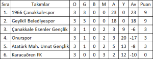 Çanakkale Birinci Amatör Lig C-Grubu 3.Hafta Puan Durumu: