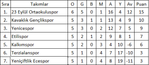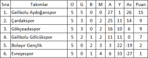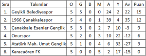 Çanakkale Birinci Amatör Lig A-Grubu 5.Hafta Puan Durumu:
