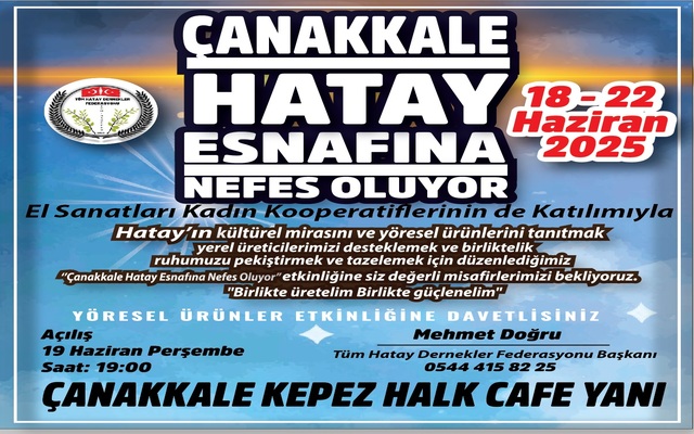Çanakkale, 18-22 Haziran 2025 tarihleri arasında anlamlı bir dayanışma etkinliğine ev sahipliği yapıyor. Tüm Hatay Dernekleri Federasyonu öncülüğünde düzenlenen “Çanakkale Hatay Esnafına Nefes Oluyor” etkinliği, Kepez Halk Cafe yanında vatandaşlarla buluşuyor. Etkinlik, Hatay’ın kültürel mirasını ve yöresel ürünlerini tanıtmak, yerel üreticilere destek sağlamak ve birlik ruhunu pekiştirmek amacıyla düzenleniyor.