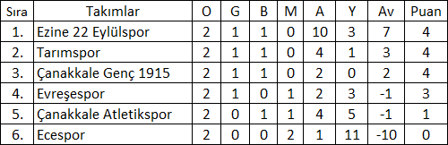 Çanakkale İkinci Amatör Lig 2.Hafta B-Grubu Puan Durumu: