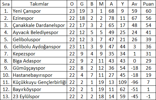 Çanakkale Süper Amatör Lig 24.Hafta Puan Durumu: