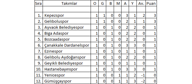 Çanakkale Süper Amatör Lig 1.Hafta Puan Durumu: