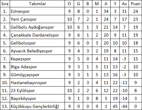 Çanakkale Süper Amatör Lig 10.Hafta Puan Durumu: