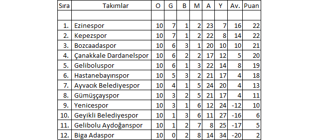 Çanakkale Süper Amatör Lig 10.Hafta Puan Durumu: