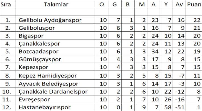 Çanakkale Süper Amatör Lig 10.Hafta Puan Durumu: