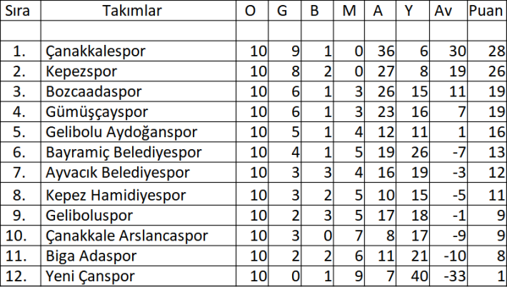 Çanakkale Süper Amatör Lig 10.Hafta Puan Durumu: