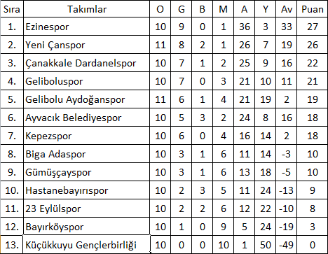 Çanakkale Süper Amatör Lig 11.Hafta Puan Durumu: