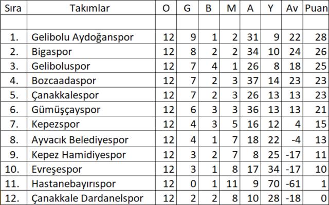 Çanakkale Süper Amatör Lig 12.Hafta Puan Durumu: