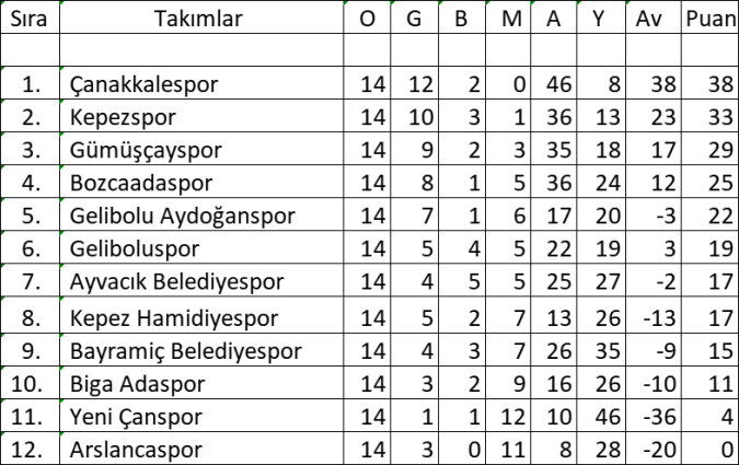 Çanakkale Süper Amatör Lig 14.Hafta Puan Durumu: