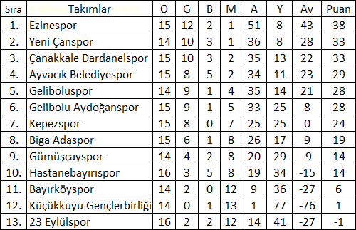 Çanakkale Süper Amatör Lig 16.Hafta Puan Durumu: