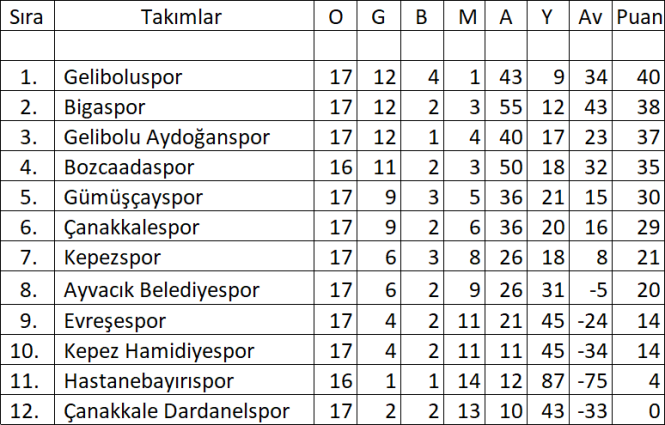 Çanakkale Süper Amatör Lig 17.Hafta Puan Durumu: