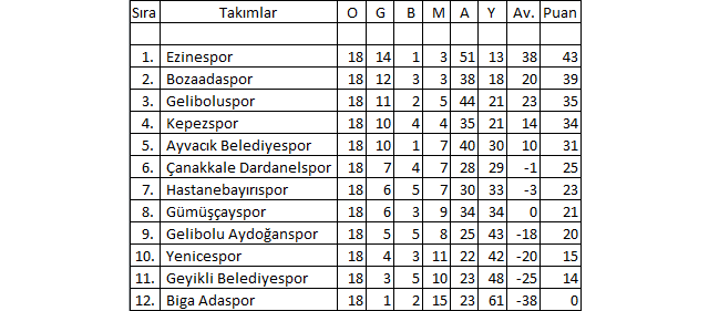 Çanakkale Süper Amatör Lig 18.Hafta Puan Durumu: