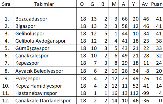Çanakkale Süper Amatör Lig 18.Hafta Puan Durumu: