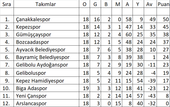 Çanakkale Süper Amatör Lig 18.Hafta Puan Durumu: