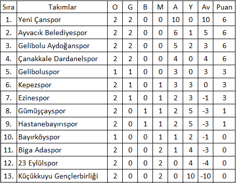 Çanakkale Süper Amatör Lig 2.Hafta Puan Durumu:
