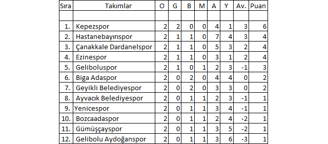 Çanakkale Süper Amatör Lig 2.Hafta Puan Durumu: