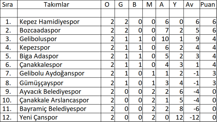 Çanakkale Süper Amatör Lig 2.Hafta Puan Durumu: