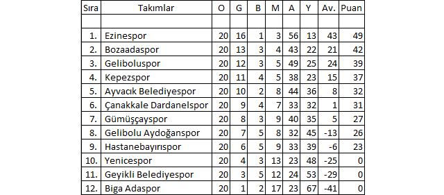 Çanakkale Süper Amatör Lig 20.Hafta Puan Durumu: