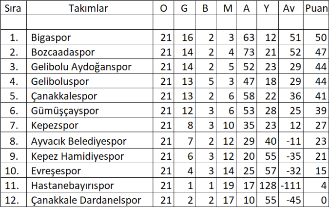 Çanakkale Süper Amatör Lig 21.Hafta Puan Durumu: